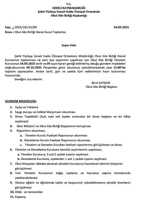 Okul Aile Birliği toplantımız 9 Ekim 2025 Perşembe günü saat 11.00'de yapılacaktır.